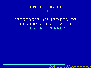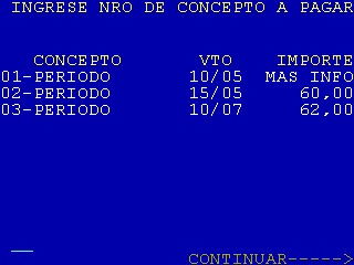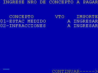 | 9 |  | Esta pantalla es condicional y solamente será mostrada para aquellos entes que tengan configurados más de un concepto. Puede ser mostrada luego de la pantalla 4 o 7. El campo concepto es de 13 posiciones y si el importe del concepto es fijo, se mostrará dicho importe sin darle lugar al usuario a ingresarlo, caso contrario se verá la leyenda «A INGRESAR» |