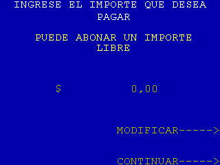 | 12 |  | Pantalla de ingreso de importe. Para el caso de los entes con base que permitan ingreso de distinto importe al indicado en base, y de acuerdo al tipo de pago (mayor o igual, menor o igual, libre) la leyenda puede ser: MAYOR AL INFORMADOMENOR AL INFORMADO |