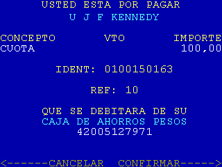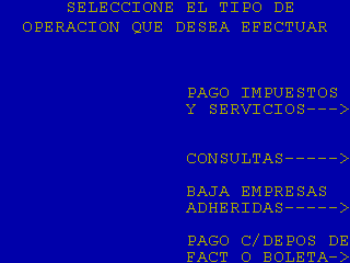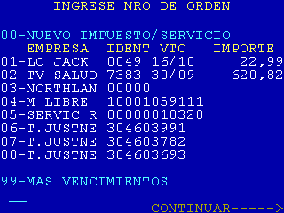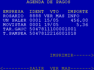 | 4 |  | Cuando se selecciona «PAGO DE IMPUESTOS Y SERVICIOS» de pantalla 1 y el sistema encuentra información en la Agenda de Pagos para la tarjeta que está operando, se muestra esta pantalla. En la columna IDENT se informan las 4 últimas posiciones de la identificación de usuario. |