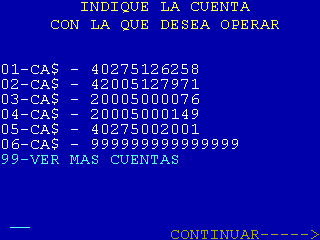 | 21 |  | Luego de la pantalla 20, se muestra esta pantalla. La columna CT es el Código de pago Telefónico |