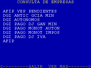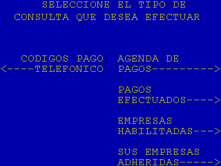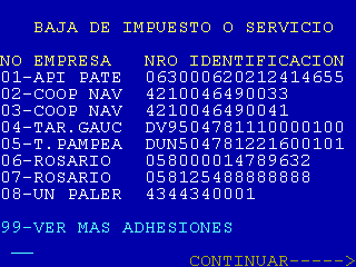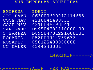 | 20 |  | Si en la pantalla 16 se selecciona «SUS EMPRESAS ADHERIDAS» se llega a esta pantalla que sirve para definir si se van a listar las empresas adheridas. A partir de aquí se dispara la consulta «Códigos de Pago Telefónico» y se pasa a la pantalla 21 |