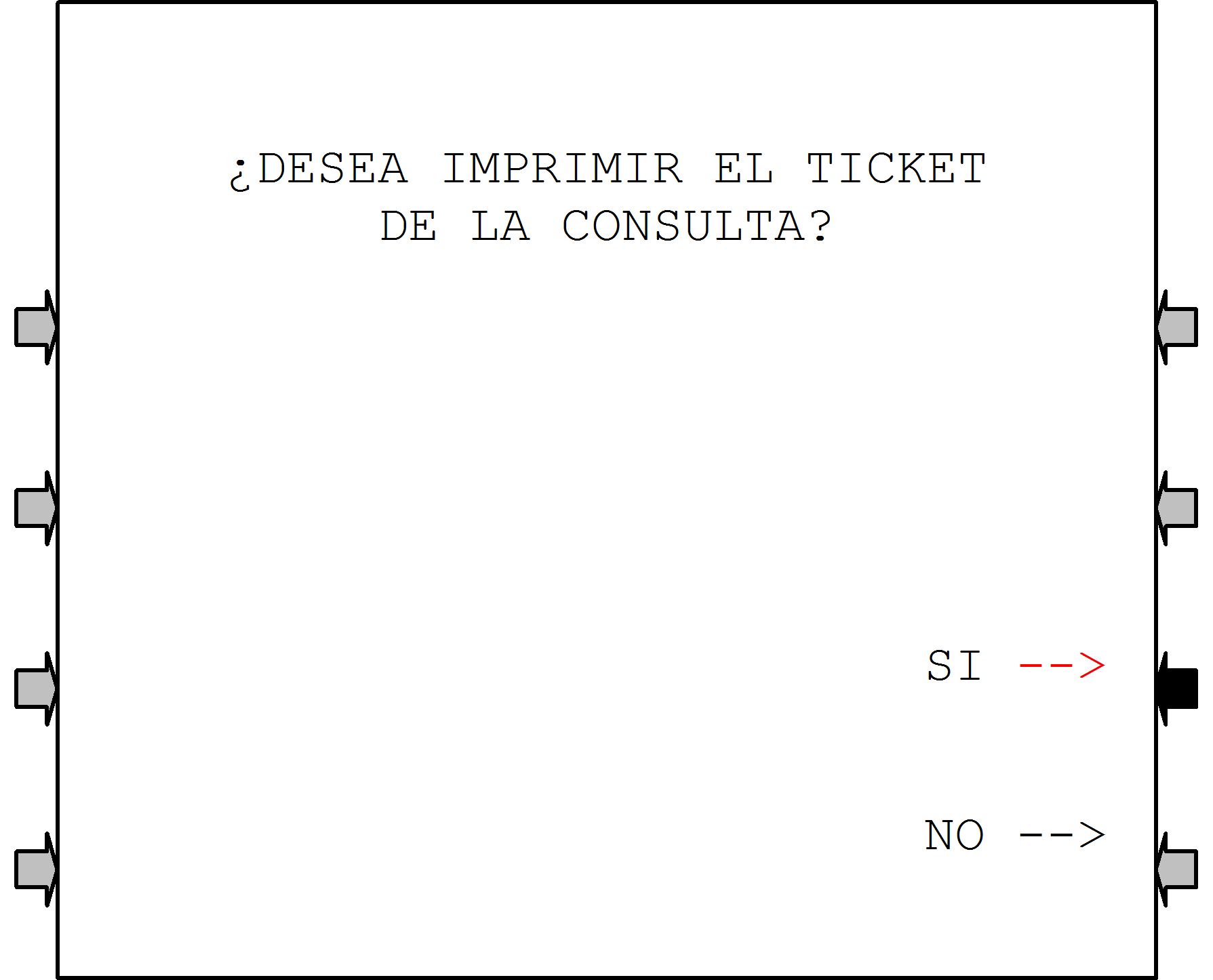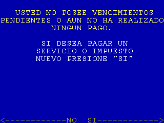 | 3 |  | Cuando se selecciona «PAGO DE IMPUESTOS Y SERVICIOS» de pantalla 1, el sistema busca si en la «Agenda de pagos» de la tarjeta que está operando hay información. Si no encuentra mostrará esta pantalla. |