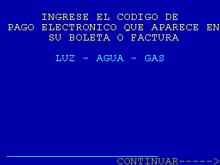 | 6 |  | Luego de la pantalla 5 (y si llegó a 5 por 3 o por 4 opción 00), se accede a esta pantalla que es la del ingreso del CPE (Código de pago electrónico) |